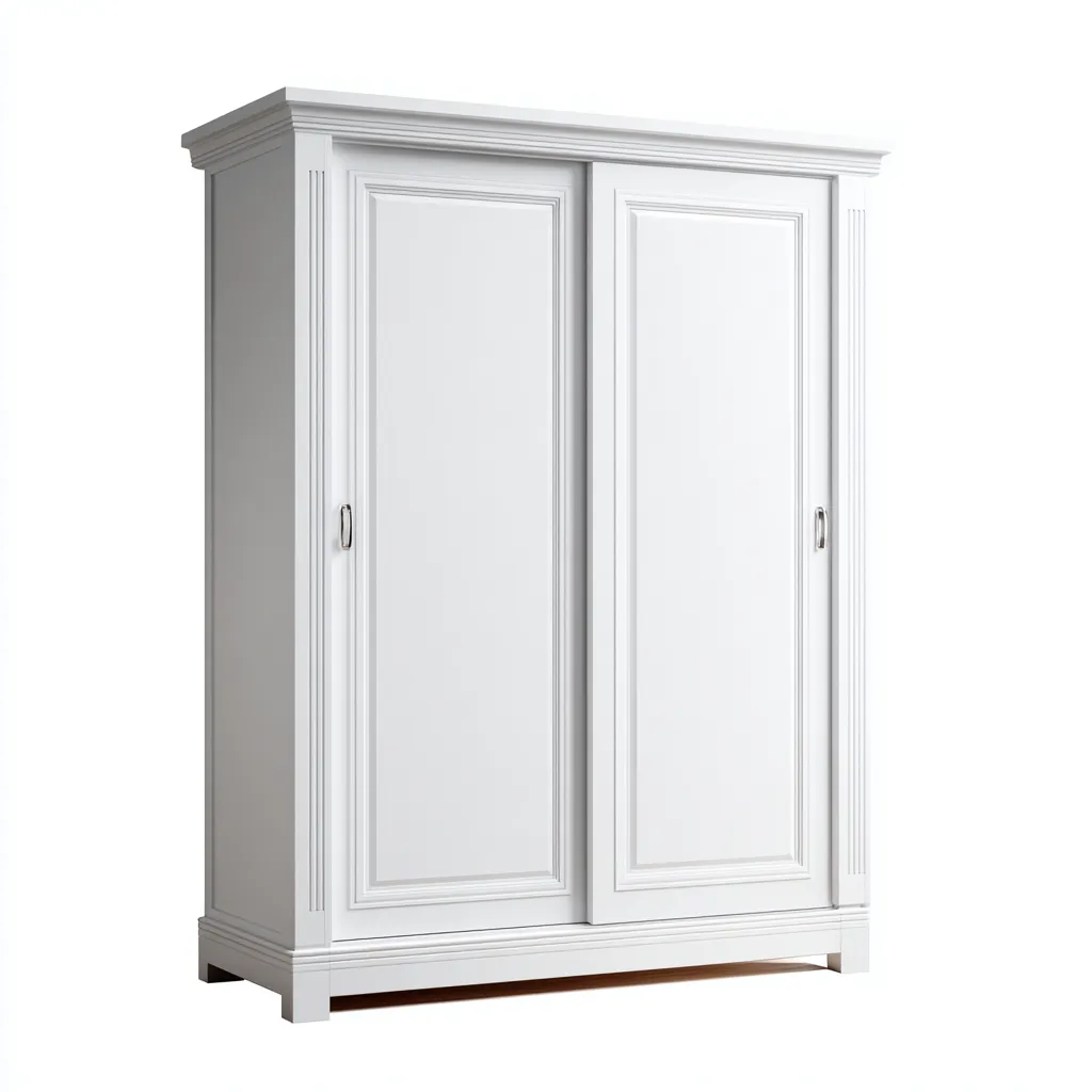 Este armario de estilo clásico con puertas correderas ofrece una solución amplia y elegante para el almacenamiento en dormitorios y espacios del hogar. Su acabado blanco y los moldurados decorativos aportan un aspecto refinado y atemporal.