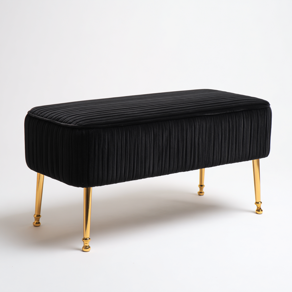 Este banco de dormitorio presenta un asiento tapizado en terciopelo negro con líneas verticales y patas metálicas en acabado dorado, ofreciendo un estilo moderno y elegante ideal para complementar el dormitorio.