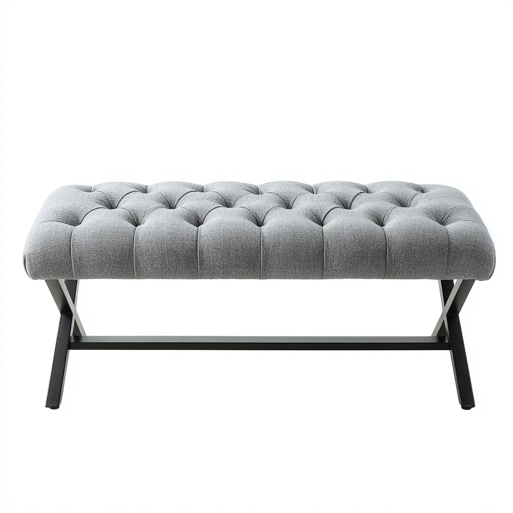Este banco de dormitorio presenta un diseño moderno con un asiento tapizado en color gris y acabado capitoné, ofreciendo comodidad y un estilo contemporáneo para dormitorios y espacios interiores.
