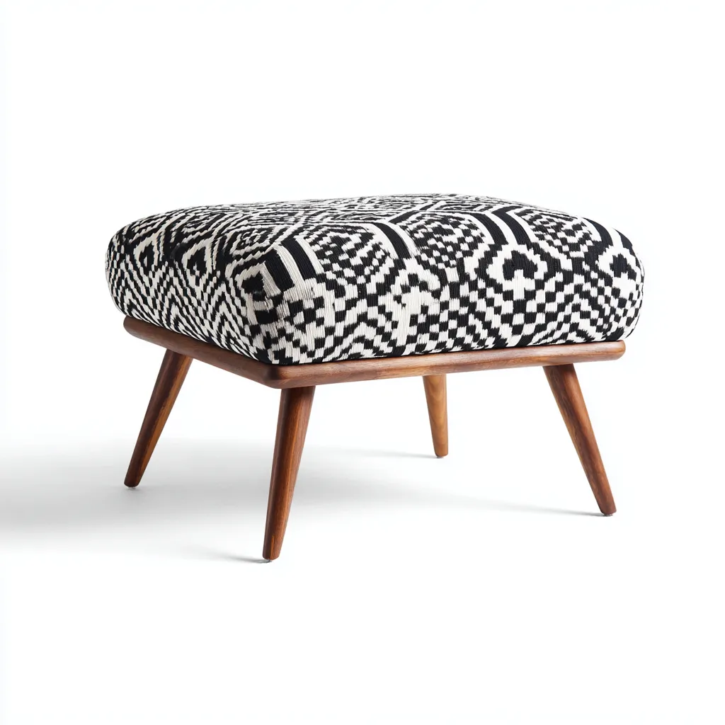 El asiento está tapizado en tela con un diseño geométrico en tonos negro y blanco. La base y las patas están fabricadas en madera con acabado natural, proporcionando estabilidad y un toque cálido.