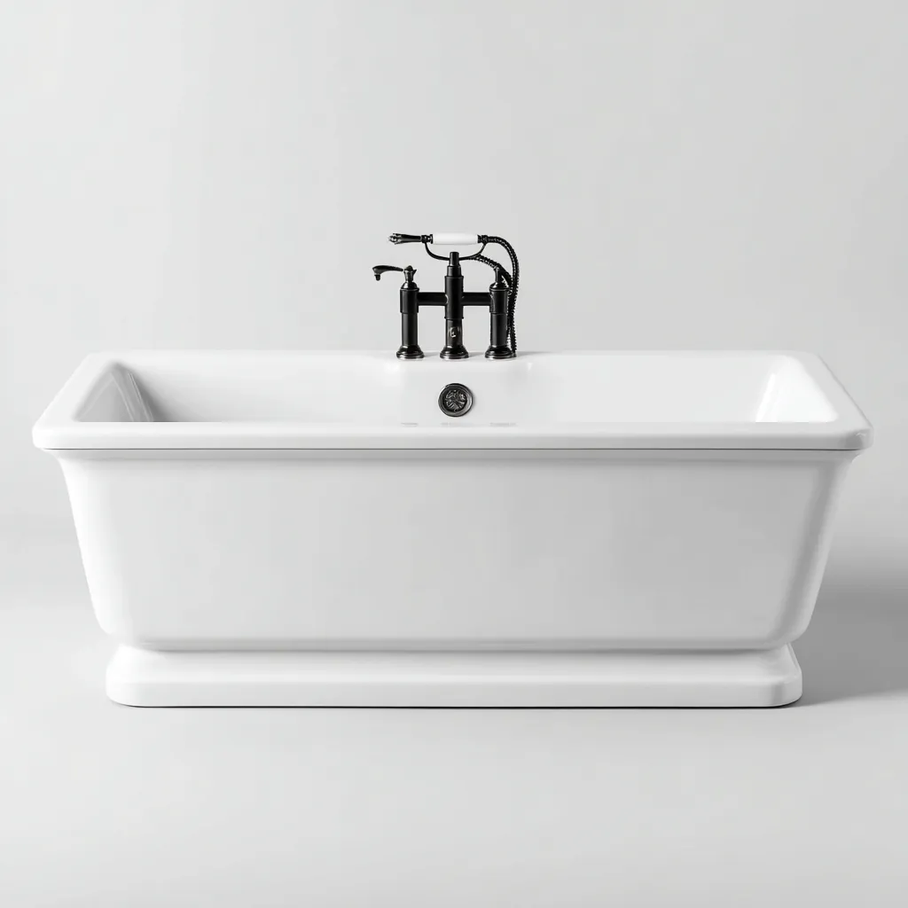 Esta bañera independiente de estilo clásico presenta una estructura rectangular con bordes ligeramente redondeados, aportando una estética elegante y atemporal al cuarto de baño. Su interior amplio permite disfrutar de una experiencia de baño cómoda y envolvente.