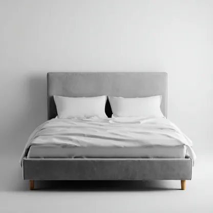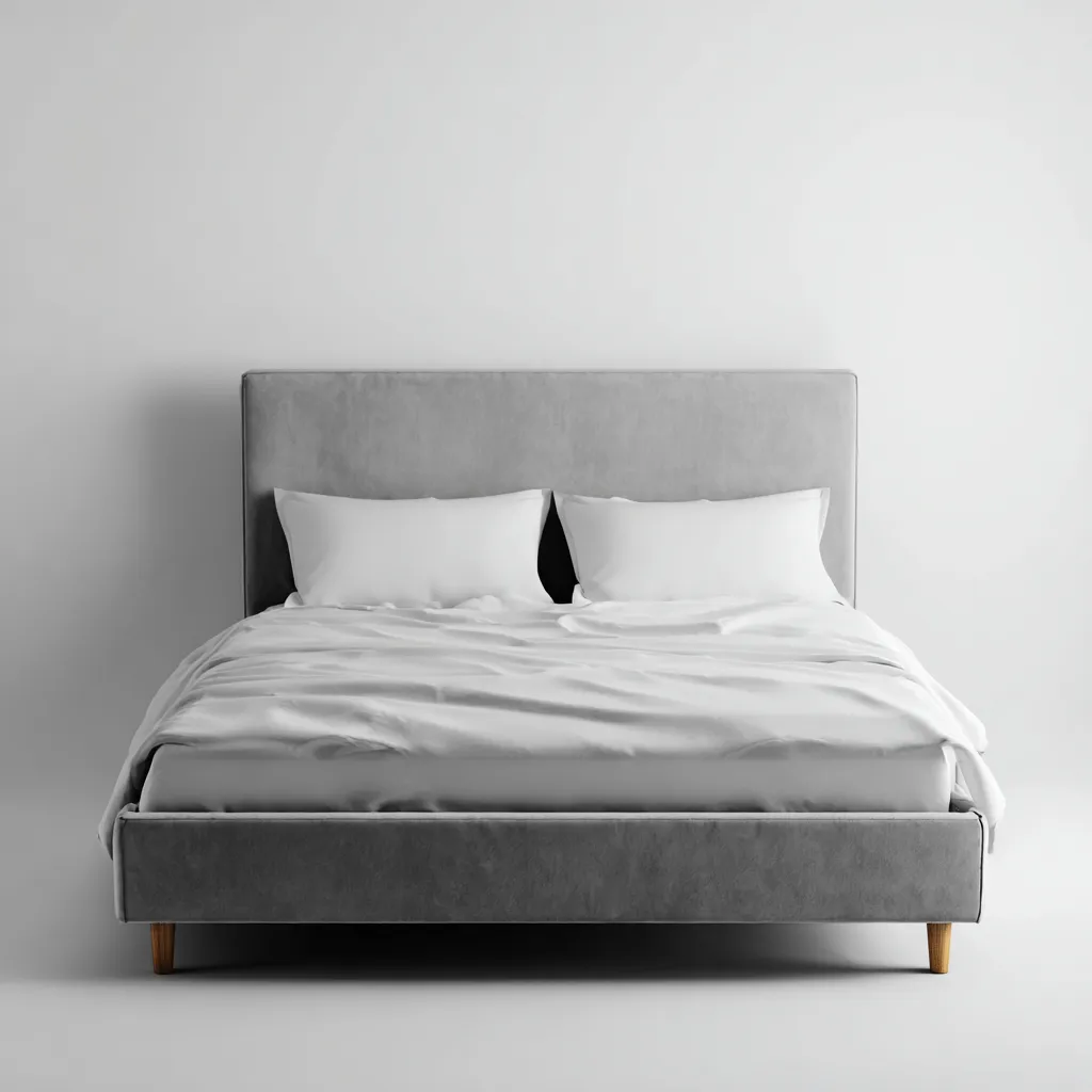 Esta cama matrimonial tapizada en gris presenta un estilo moderno y sobrio, ideal para crear un ambiente equilibrado y acogedor en el dormitorio. Su cabecero amplio y líneas rectas aportan una estética limpia y actual.