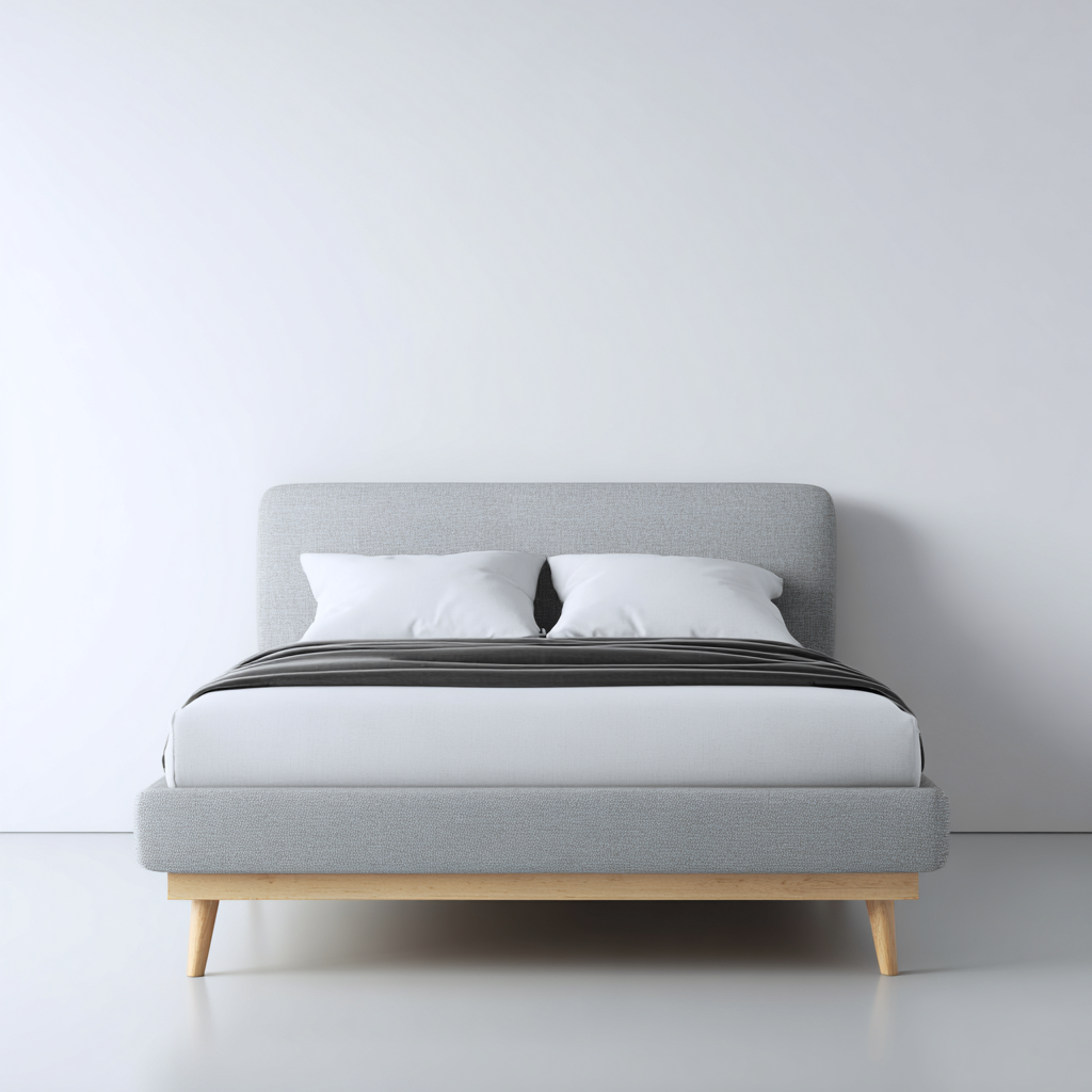 Esta cama matrimonial de diseño moderno incorpora una estructura tapizada en gris claro y patas de madera natural, ofreciendo una pieza elegante y funcional para el dormitorio. Su cabecero redondeado aporta suavidad visual y comodidad.