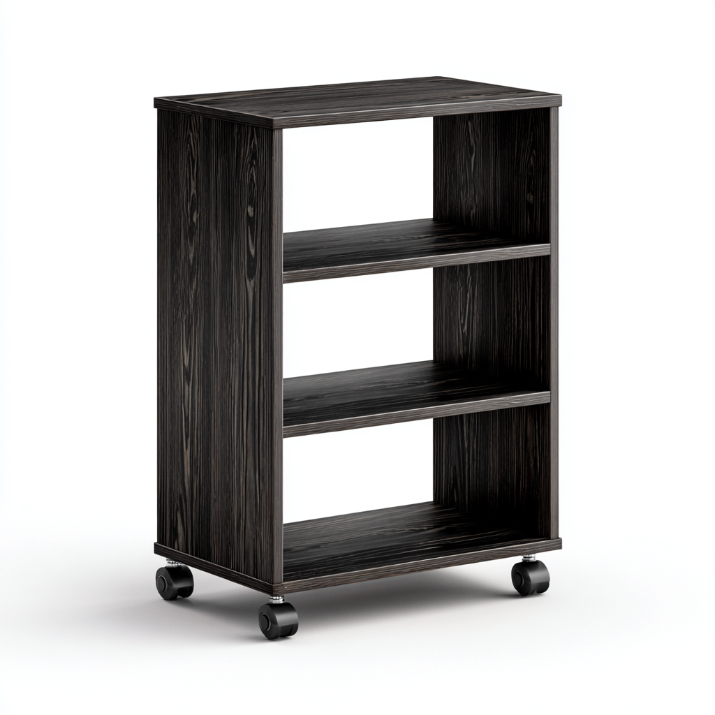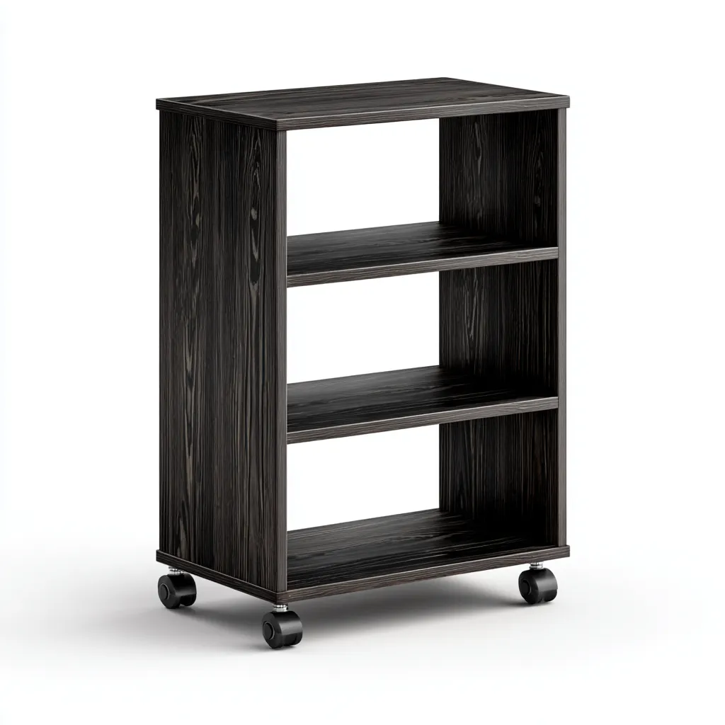 El cuerpo del carrito está fabricado en tablero laminado con acabado en color negro madera aportando resistencia y un aspecto elegante. Las superficies son fáciles de limpiar y adecuadas para el uso cotidiano.