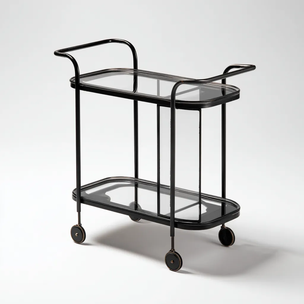El carrito está fabricado con un marco de metal en color negro y dos estantes de vidrio templado transparente. Las ruedas permiten moverlo con facilidad según las necesidades del espacio.