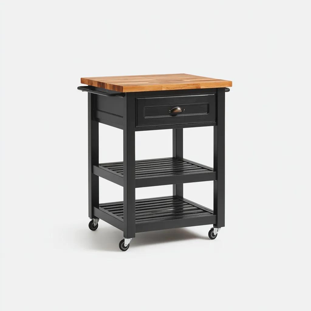El carrito incorpora un cajón práctico para utensilios pequeños y dos estantes abiertos para almacenamiento adicional. Las ruedas inferiores proporcionan movilidad y permiten colocarlo en diferentes áreas de la cocina.