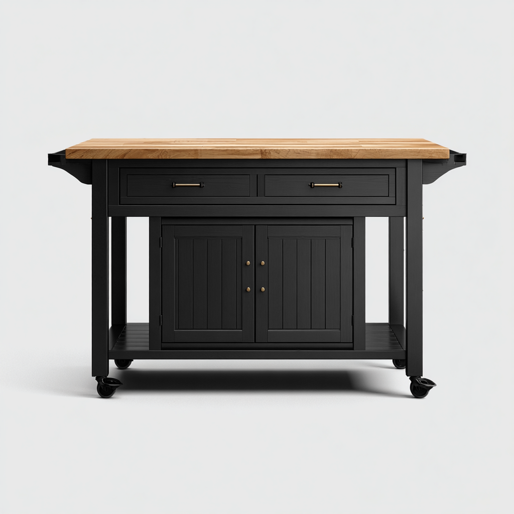 El diseño incorpora cajones superiores para utensilios y un compartimento inferior con puertas que permite organizar objetos de cocina. El espacio abierto en la base ofrece capacidad adicional para almacenamiento. Las ruedas integradas facilitan el desplazamiento de la isla dentro del área de cocina.