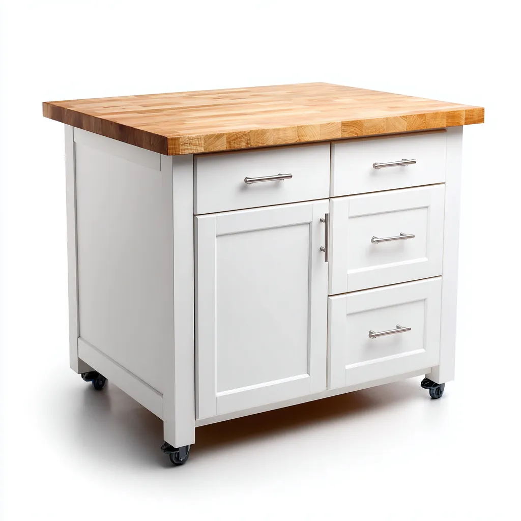 Esta isla de cocina presenta un diseño moderno y funcional, combinando una encimera de madera natural con una estructura en acabado blanco. Su estética limpia y práctica la convierte en una pieza ideal para ampliar la superficie de trabajo y almacenamiento en la cocina.