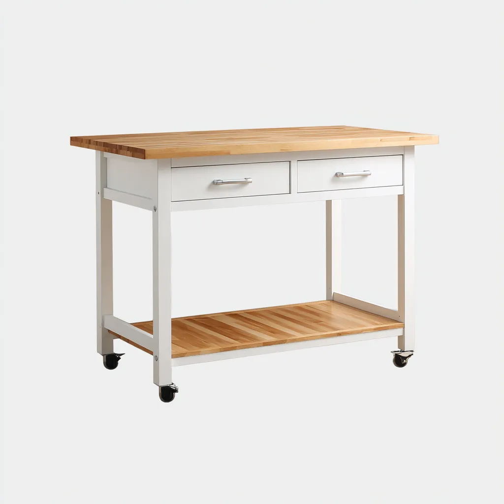 Esta isla de cocina presenta un diseño moderno y ligero, combinando una encimera de madera natural con una estructura en color blanco. Proporciona una superficie adicional para preparar alimentos y un espacio práctico para organizar utensilios.