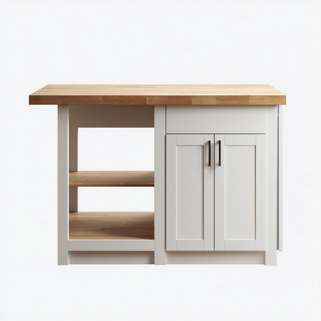 Esta isla de cocina combina funcionalidad y diseño moderno, ofreciendo una superficie amplia para preparar alimentos y organizar utensilios. Su estética en blanco con encimera de madera aporta luminosidad y calidez al espacio.
