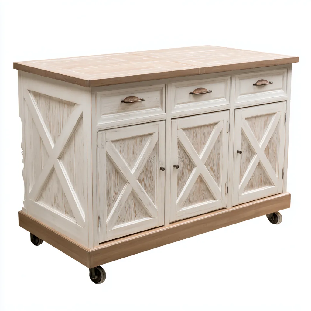 Esta isla de cocina destaca por su diseño rústico, con puertas decoradas en forma de aspa y una encimera de madera natural que aporta calidez y estilo al espacio. Su estructura amplia ofrece una superficie funcional para la preparación de alimentos y el almacenamiento.