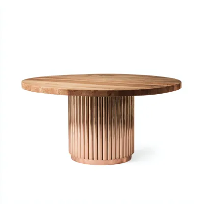 Esta mesa de comedor moderna combina un tablero de madera natural con una base metálica en acabado oro rosado que aporta un toque elegante y distintivo al espacio. Su forma redonda crea un ambiente equilibrado y facilita la interacción entre los comensales.