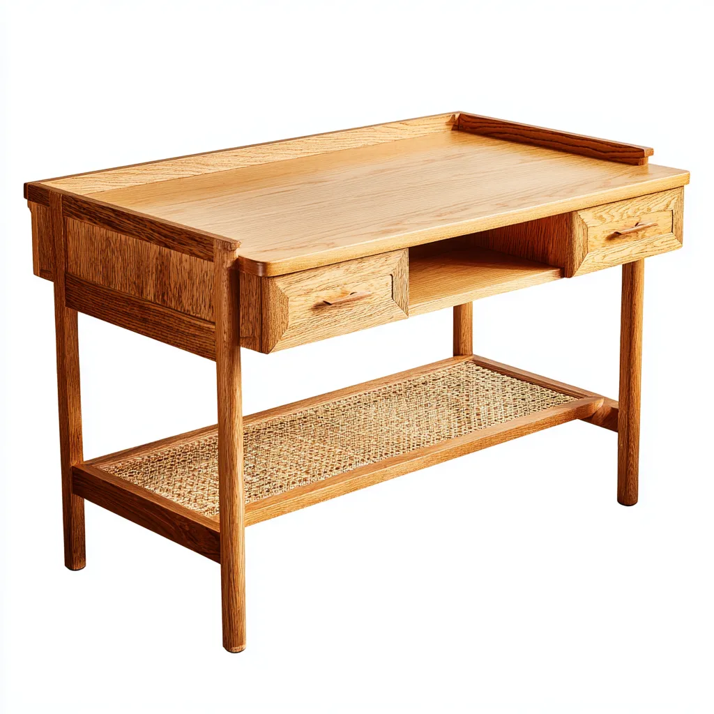 Esta mesa de oficina de madera natural combina un diseño funcional con una estética cálida, ideal para espacios de trabajo domésticos o profesionales. Su estructura abierta permite mantener el área de trabajo organizada sin perder amplitud visual.