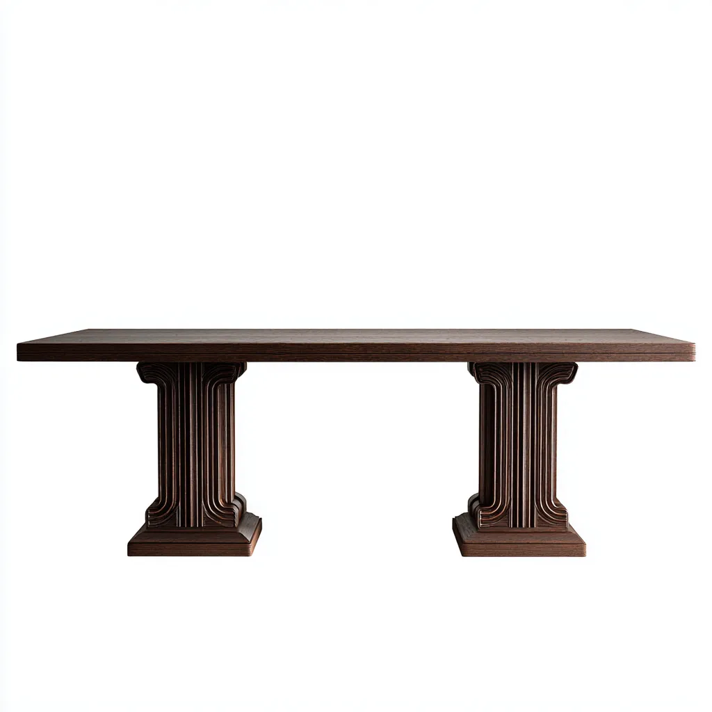 Fabricada en madera maciza con un acabado liso y uniforme, la superficie ofrece una textura natural y resistente. Las bases de soporte, diseñadas con formas inspiradas en columnas clásicas, aportan estabilidad y un fuerte carácter decorativo.