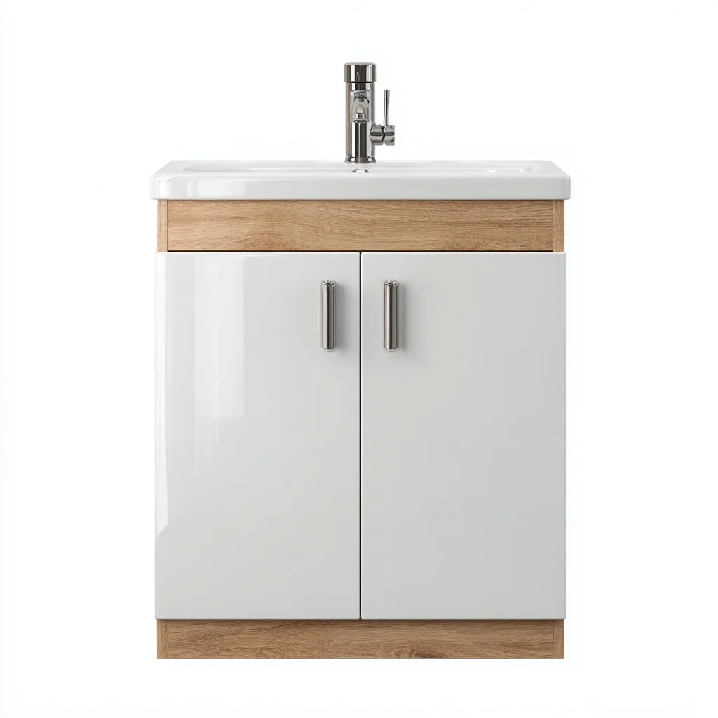 Este mueble de baño con lavabo ofrece una solución compacta y funcional para baños pequeños y medianos. Su combinación de acabado blanco brillante y detalles en efecto roble crea un estilo moderno y cálido.