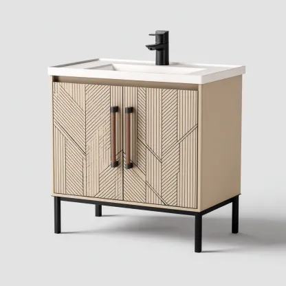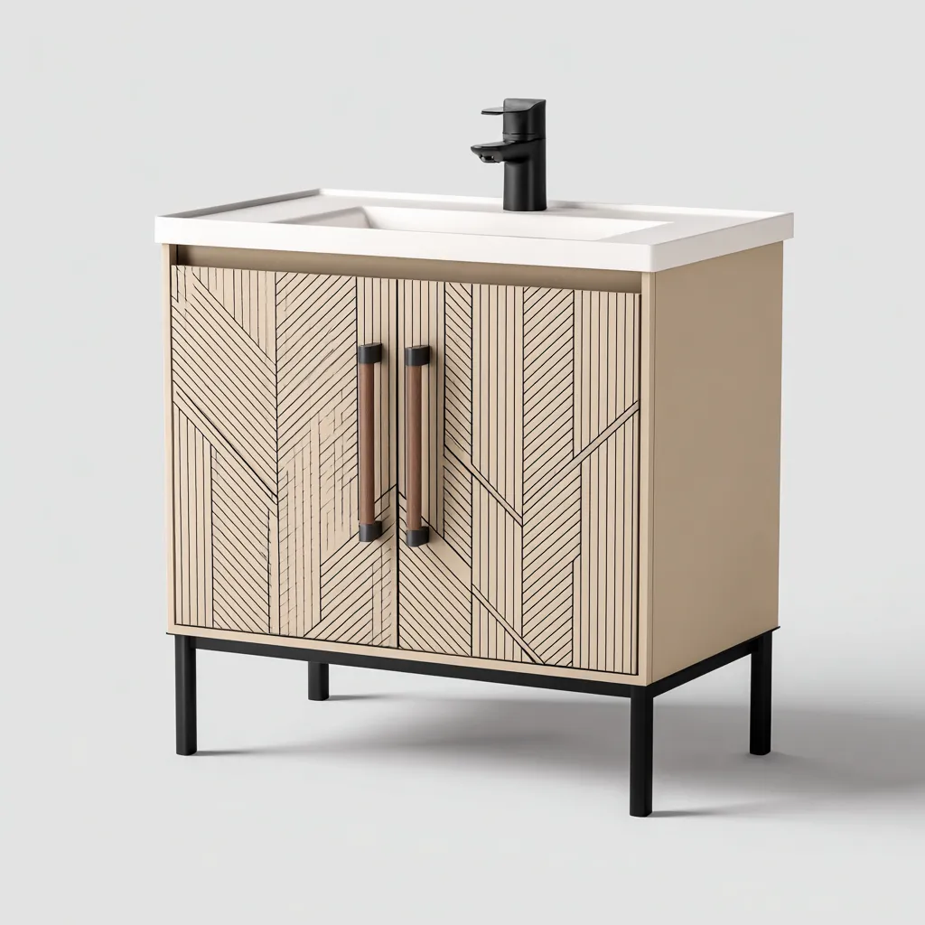 Este mueble de baño con lavabo combina un diseño moderno con un estilo decorativo único en las puertas frontales. Sus líneas geométricas y la estructura elevada sobre patas metálicas aportan un toque contemporáneo al cuarto de baño.