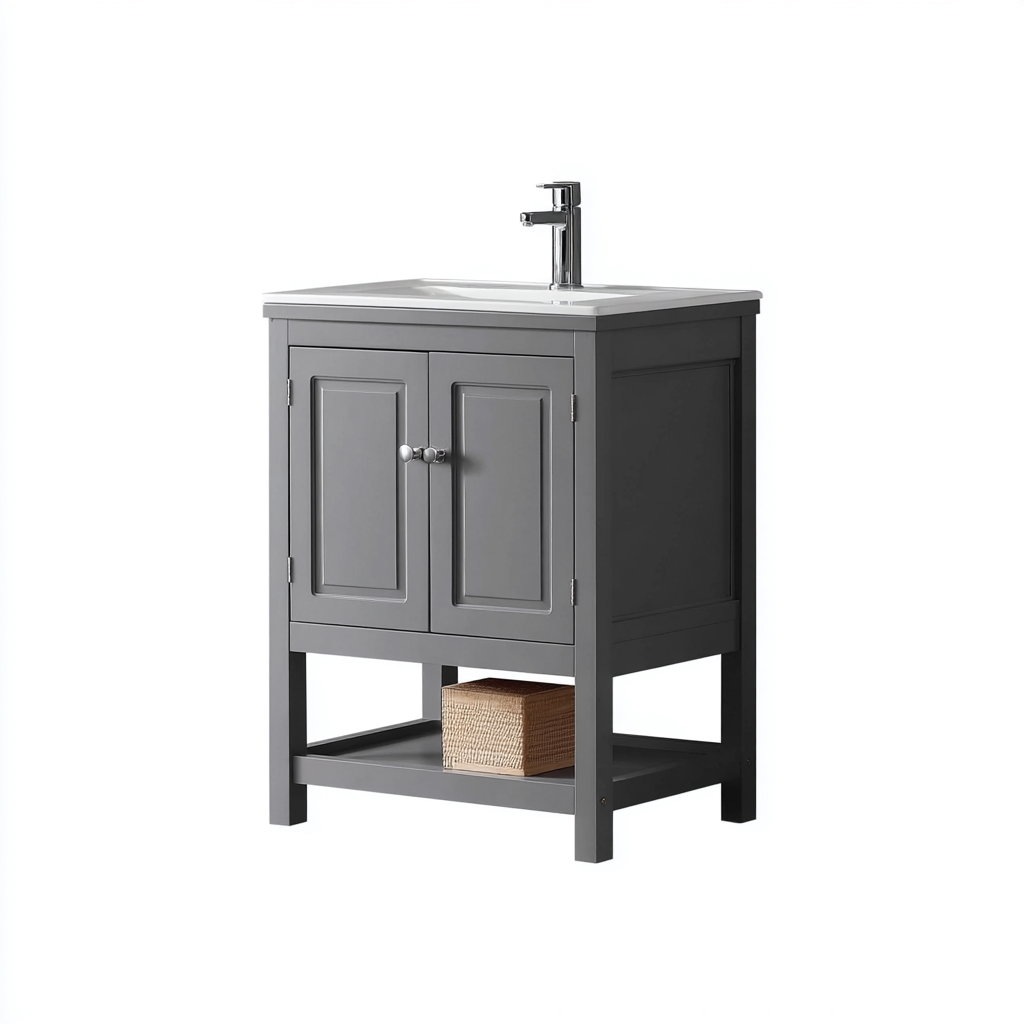 Este mueble de baño con lavabo combina un estilo clásico con una estructura práctica, ideal para baños de diferentes tamaños. Su diseño en color gris aporta una estética suave y elegante al espacio.