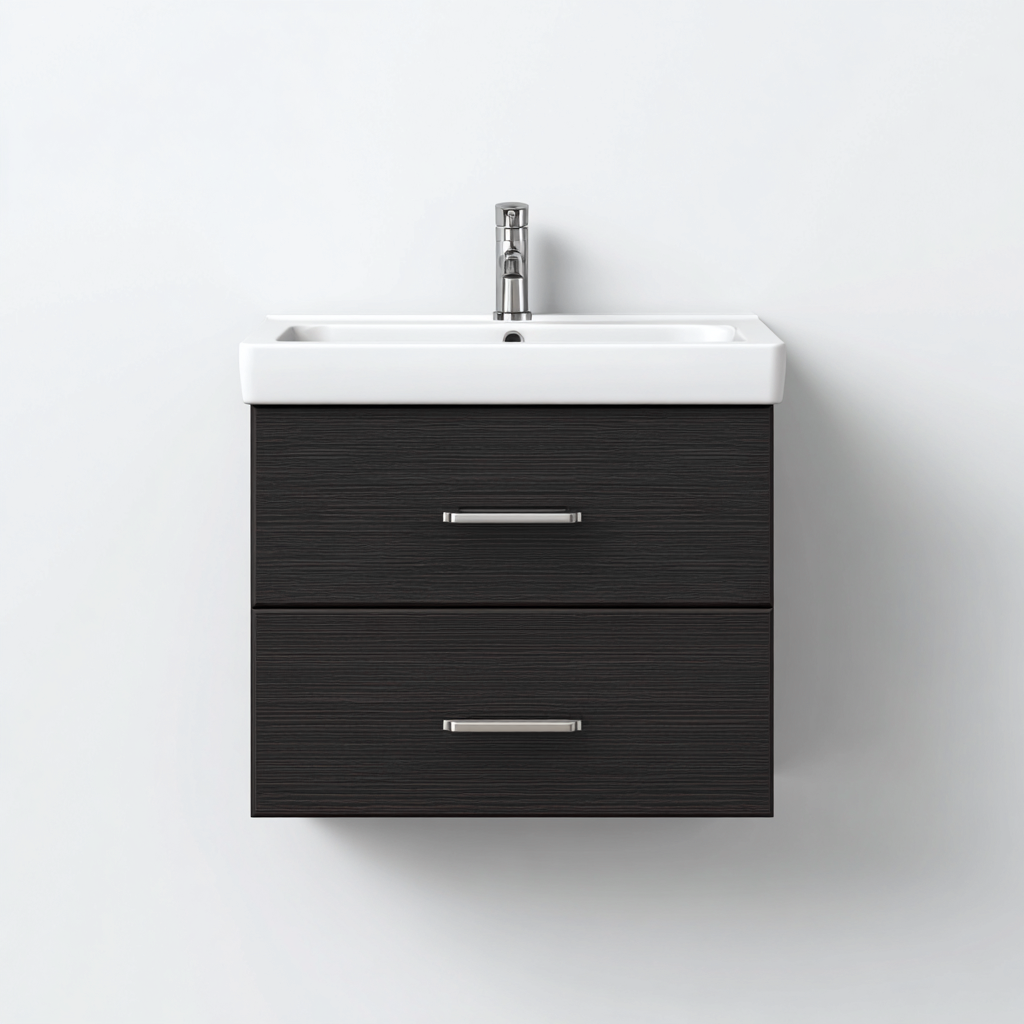 Fabricado en tablero de madera revestido con textura de veta en tono gris oscuro, ofrece una superficie resistente y fácil de limpiar. El lavabo superior de cerámica blanca crea un contraste equilibrado y visualmente atractivo. Los tiradores metálicos refuerzan su estilo contemporáneo.