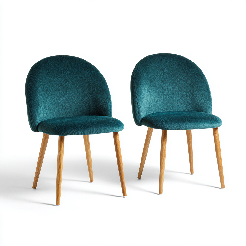Estas sillas de comedor presentan un diseño moderno con asiento tapizado en color verde y patas de madera, creando un estilo cálido y contemporáneo para diferentes ambientes interiores. Su forma redondeada aporta comodidad visual y facilidad de combinación.