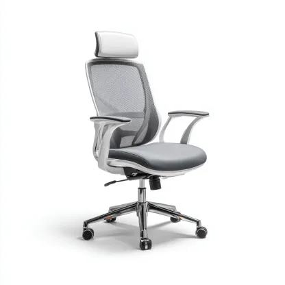 El respaldo está fabricado con malla resistente de alta ventilación, mientras que el asiento acolchado presenta un tapizado gris de textura suave. La estructura inferior de metal cromado y los reposabrazos en acabado blanco aportan estabilidad y un estilo moderno.
