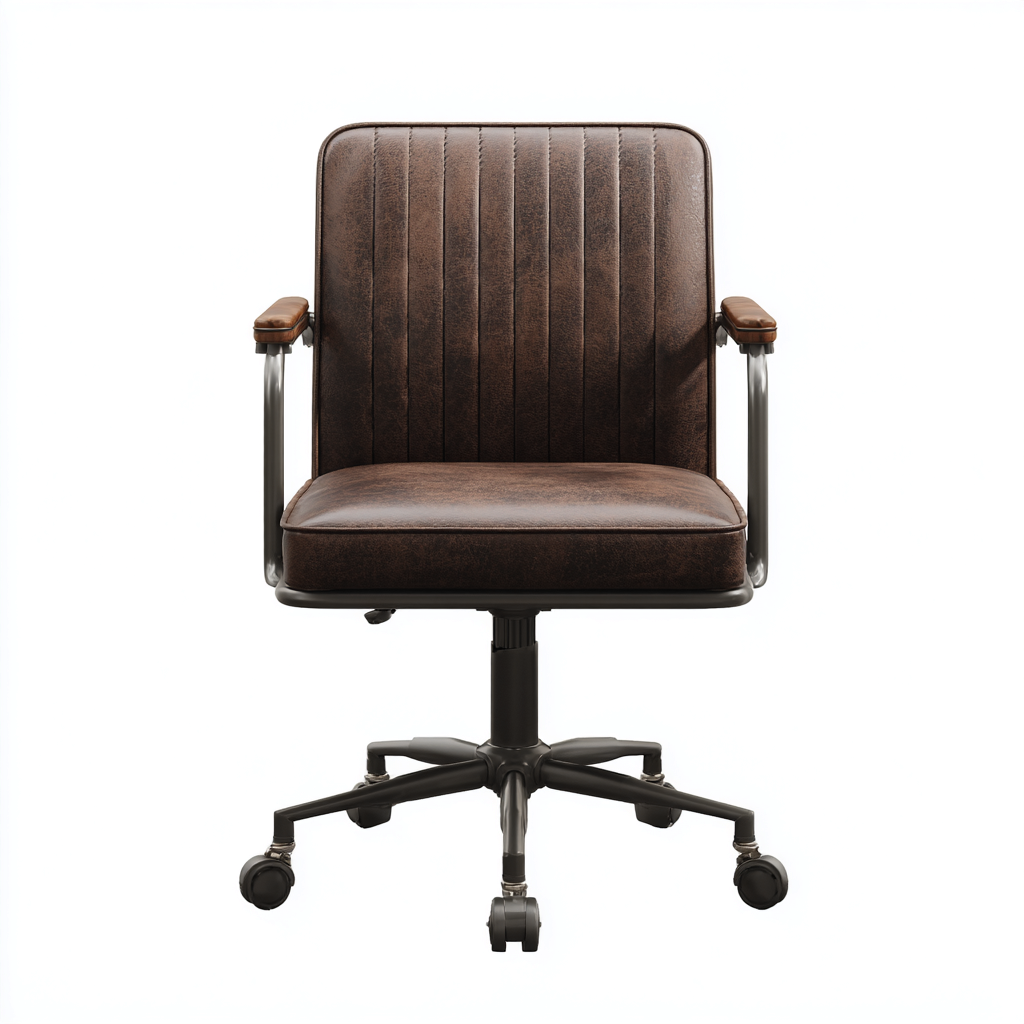 Esta silla de oficina en color marrón presenta un diseño vintage con líneas verticales en el respaldo y un asiento acolchado que proporciona comodidad durante las horas de trabajo Su estética clásica encaja en oficinas profesionales y espacios de estudio con estilo industrial o retro
