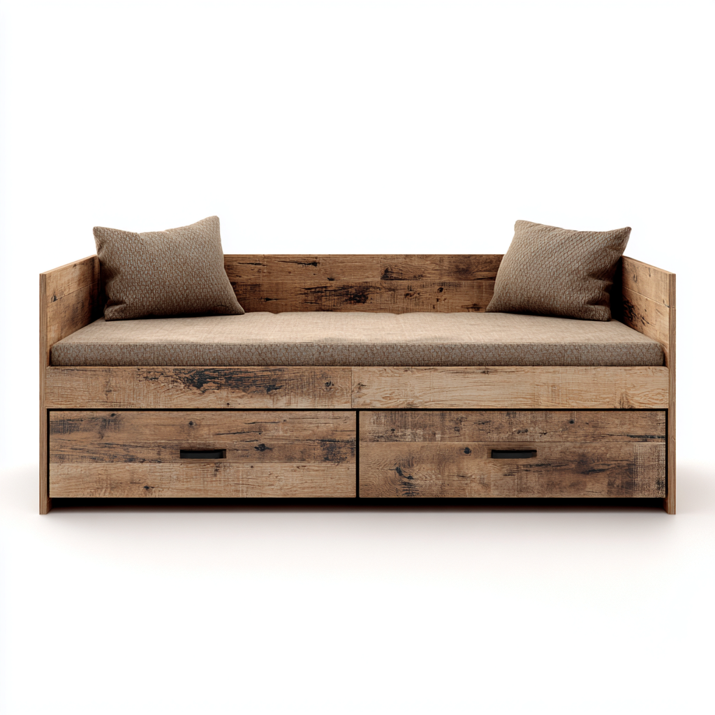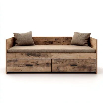 Este sofá cama de madera con acabado rústico y asiento tapizado en marrón ofrece un diseño cálido y funcional ideal para el salón. Su construcción robusta permite utilizarlo como sofá diario y como superficie adicional de descanso.